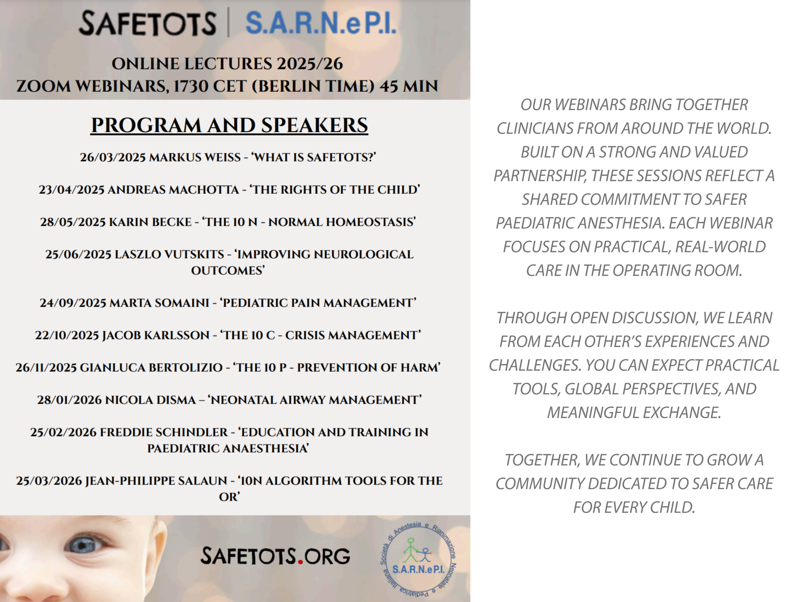 At Safetots, our mission is to advance the safety and quality of pediatric anesthesia worldwide. Children undergoing anesthesia are particularly vulnerable to physiological disturbances that may impact organ perfusion, neurological integrity, and recovery. Despite progress in pediatric perioperative care, variability in practice and access to standardized approaches remain significant challenges across institutions and regions. SafeTots aims to address this by promoting a structured, physiology-driven approach to pediatric anesthesia. Central to this is the concept of maintaining normal perioperative physiological parameters — the SafeTots 10N framework — as a foundation for safe care. Through international collaboration, education, and dissemination of practical tools, SafeTots supports clinicians in delivering consistent, evidence-informed care in the operating room and beyond. Our goal is to contribute to a global standard where safe anesthesia for children is not dependent on geography, but embedded in everyday clinical practice.